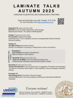 Outside of the thematic sessions, the autum series included presentations by guest speakers and LAMiNATE members: Inclusive language: What is it? And what does it mean for mono- and bilinguals? by Pascal Gygax (University of Fribourg), Continuity vs. cut-off points in SLA across the lifespan: From significant life events to high-stakes thresholds by Simone Pfenninger (University of Zurich), Cross-language generalization in treatment of multilingual aphasia: a meta-analysis by Minna Lehtonen (University of Turku), The lexical and narrative abilities of Arabic-Swedish-speaking children by Rima Haddad (Uppsala University), "After my formation, I really want to improve my English." The impact of digital translation tools on written second language output by Raphael Berthele (University of Fribourg).