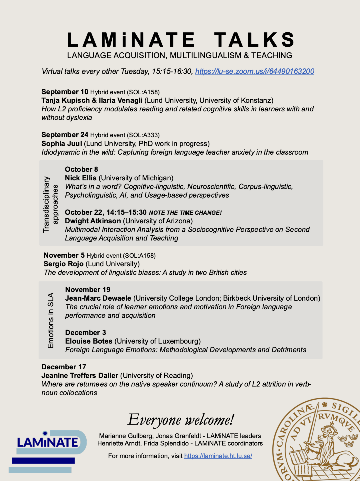 We are now just past the halfway mark in this term's LAMiNATE Talks seminar series. So far, the series has included presentations on dyslexia and L2 proficiency (Tanja Kupisch & Ilaria Venagli), foreign language teacher anxiety (Sopiha Juul) and linguistic biases in school children (Sergio Rojo). Additionally, TEAM organised a thematic block on transdisciplinary approaches that included presentations by Nick Ellis and Dwight Atkins.